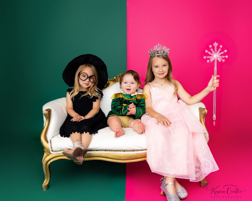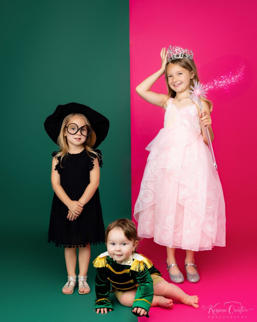 Dedemona’s session isn’t our first Wicked inspired photoshoot either! For Gavin’s cake smash session, he and his sisters dressed up as Fiyero, Glinda, and Elphaba. It was a blast capturing all three siblings together with a creative split-tone backdrop using the characters’ signature colors: green and pink.