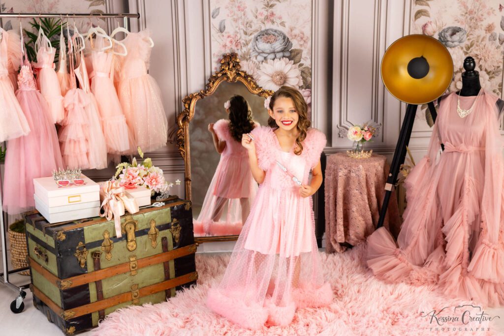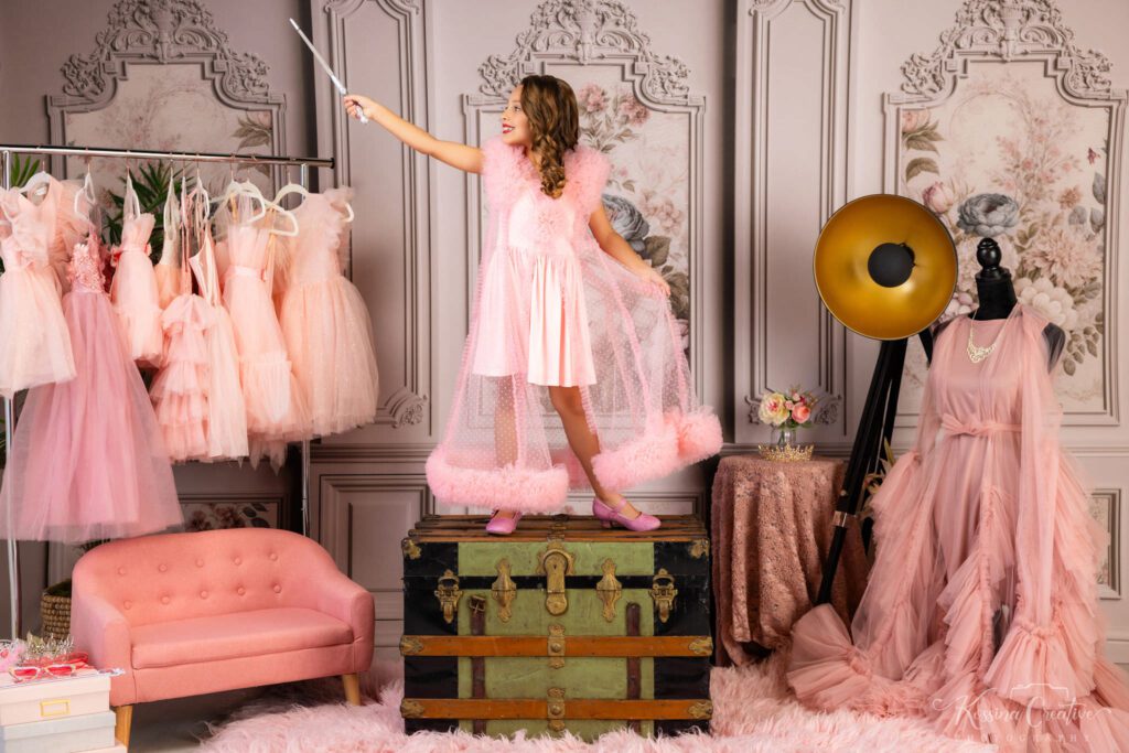 We designed a custom set that channeled Glinda’s dreamy pink bedroom — complete with sparkles, soft textures, and plenty of whimsy. Desdemona had the best time twirling around in her poofy pink gowns, laughing and posing like a true “Good Witch.”
