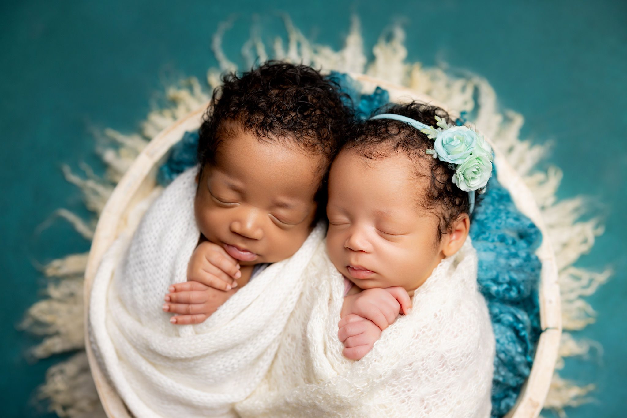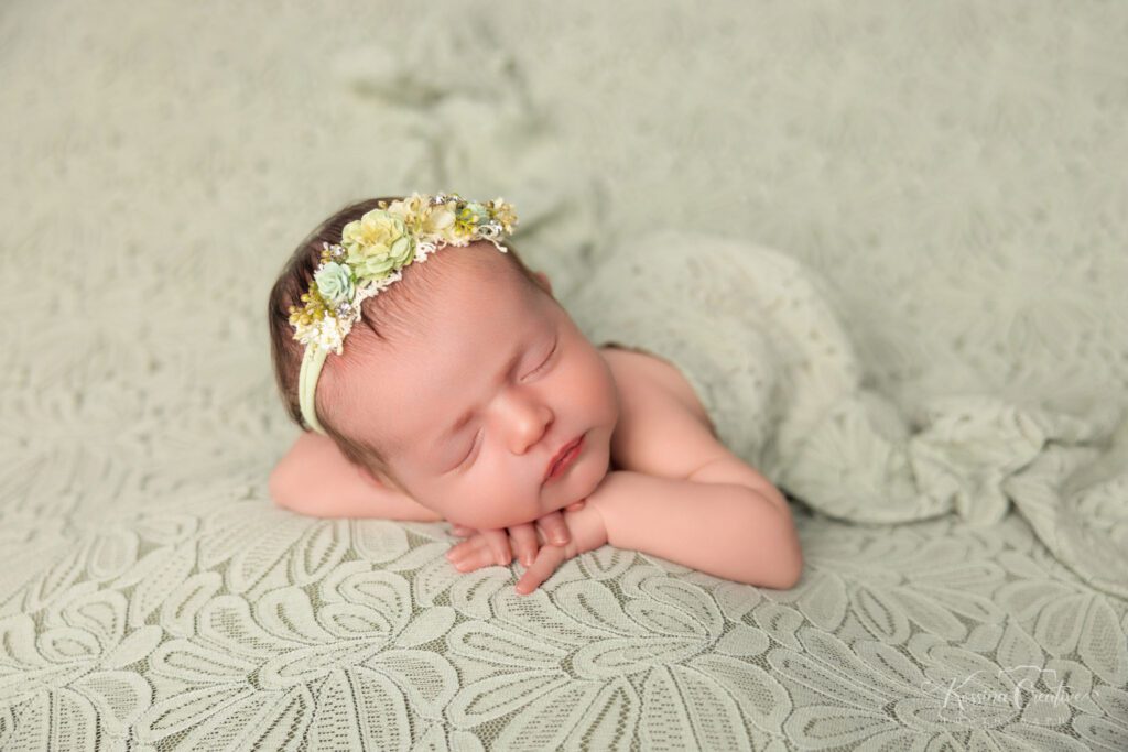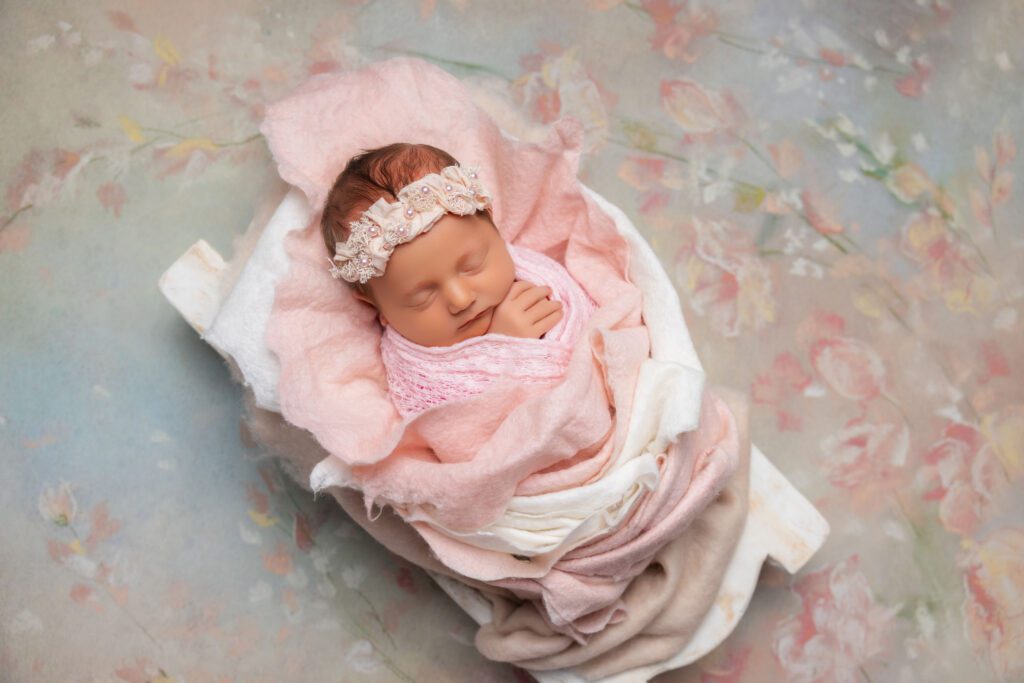 Our space is designed to support the entire experience from professional lighting and temperature control to our full collection of props, wraps, and posing setups. This allows us to move seamlessly through a variety of looks without disruption, while keeping baby calm and comfortable the entire time.