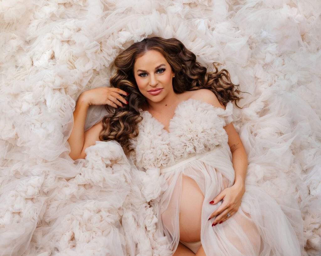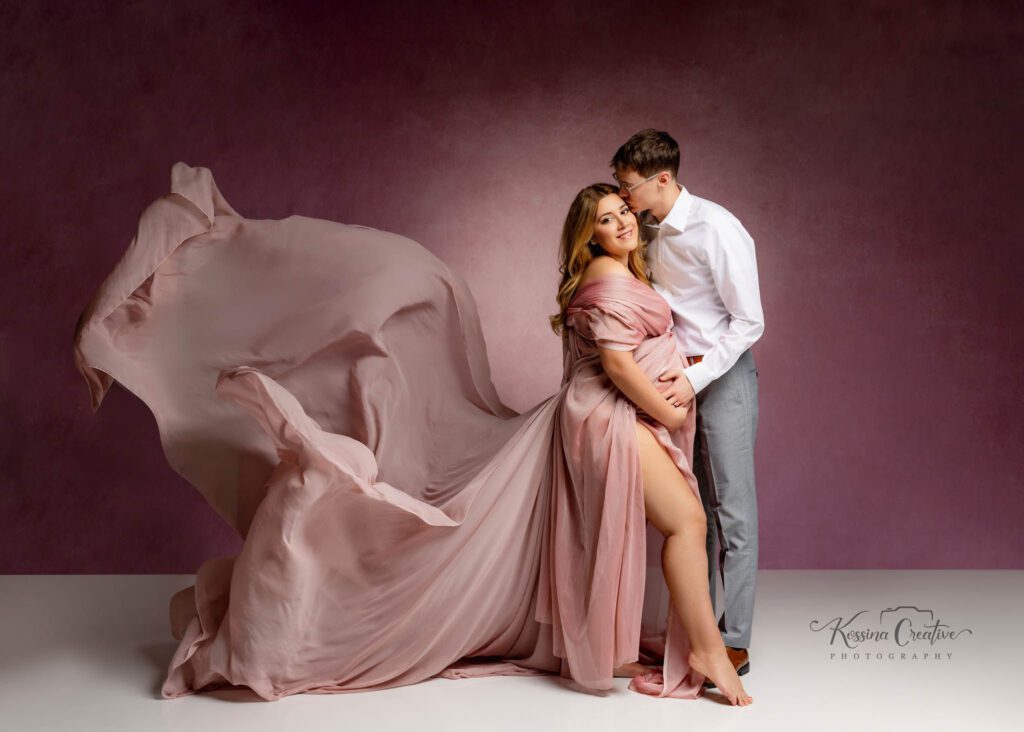 My studio has a full wardrobe of over 300 high-end maternity gowns and accessories. They are free to use on the day of your shoot! I love helping moms pick out the perfect dress for their maternity session. We even created an entire dress catalog that showcases most of our available gowns and fabrics.